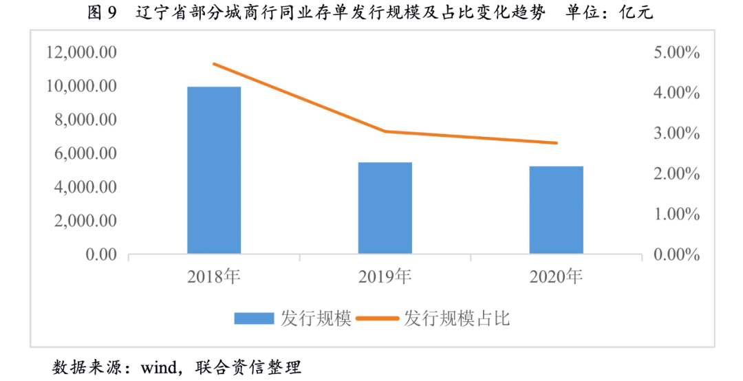 作為最早一批改革的城商行,遼寧省城商行業(yè)務種類較為豐富,同業(yè)負債來源廣泛。近年來,資本市場對于遼寧省內信用環(huán)境持審慎態(tài)度,對遼寧省整體城商行流動性產生一定影響。從遼寧省城商行同業(yè)存單發(fā)行規(guī)模來看,2018—2020年,遼寧省城商行同業(yè)存單發(fā)行規(guī)模持續(xù)下降,且占市場同業(yè)存單發(fā)行總量的比重持續(xù)下滑。從同業(yè)存單發(fā)行利率來看,樣本選取遼寧省城商行一年期同業(yè)存單發(fā)行利率,與一年期中債國債到期收益率進行比較,2020年遼寧省城商行同業(yè)存單發(fā)行規(guī)模下降的同時,利差明顯擴大。2019年,遼寧省城商行同業(yè)存單平均發(fā)行利差為0.88個百分點,2020年平均發(fā)行利差擴大至2個百分點。如前文所述,在存款業(yè)務拓展壓力加大的同時,遼寧省城商行同業(yè)融入規(guī)模有所收縮,且融資成本上升,同業(yè)負債業(yè)務難度有所上升。