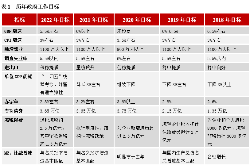 一是尊重經濟增長的規律。GDP過去兩年平均增長5.1%,2021年四季度實際增長4.0%,兩年平均增長5.2%,2019年(未受疫情影響)GDP增速為6.0%,5.5%的增速目標高于5.1%和5.2%的兩年平均增速,考慮疫情影響,稍微低于19年6.0%的增速,比較符合經濟增長的趨勢性和延續性規律。如果設置5.0%的增速目標,低于兩年平均增速,不利于經濟的增長;5.0%-5.5%的增速目標,雖然具有一定的區間彈性,但是穩增長的力度和決心不夠,預期有轉弱的壓力。