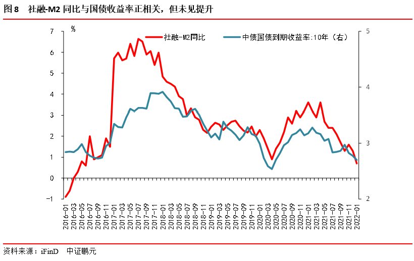 重在寬信用,特別提出擴大信貸規模。2021 年全年金融機構新增人民幣貸款 19.95 萬億元。2022年1月社融增速為10.5%,前值為10.3%;M2同比增速為9.8%,前值為9.0%。2021年1月,央行貨幣政策司司長孫國峰發表《健全現代貨幣政策框架》一文指出:“ 基本匹配不意味著完全相等,M2和社會融資規模增速可以根據經濟形勢和宏觀經濟治理需要略高或略低于名義經濟增速,體現逆周期調節”。央行四季度貨幣政策執行報告指出“2021 年末,M2 和社會融資規模同比增速分別為 9%和 10.3%,同名義經濟增速基本匹配。從兩年平均看,2020 年、2021 年 M2 和社會融資規模增速分別為 9.5%和 11.8%,同兩年平均名義經濟增速基本匹配并略高”。今年社融增速預計在11.0%左右,比較符合預期,可能略高于名義經濟增速。
