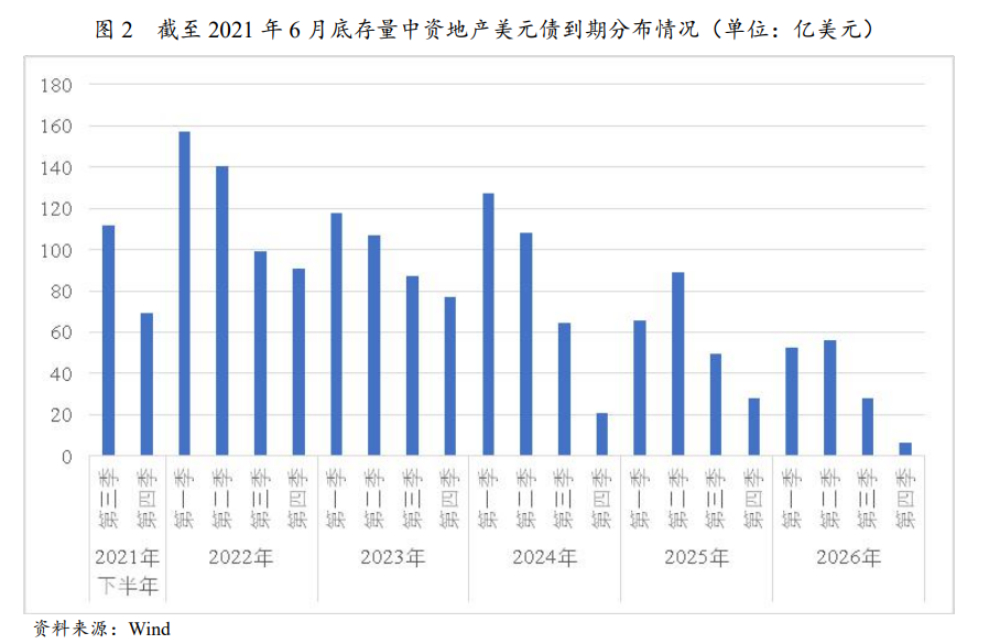 從未來的到期情況看,未來1年房企大量美元債密集到期。截至2021年6月底,未來12個月內逾478億美元債務面臨到期,其中2022年1季度到期規模最大,再融資需求大。若市場持續大幅波動,將進一步加劇房地產企業再融資壓力。