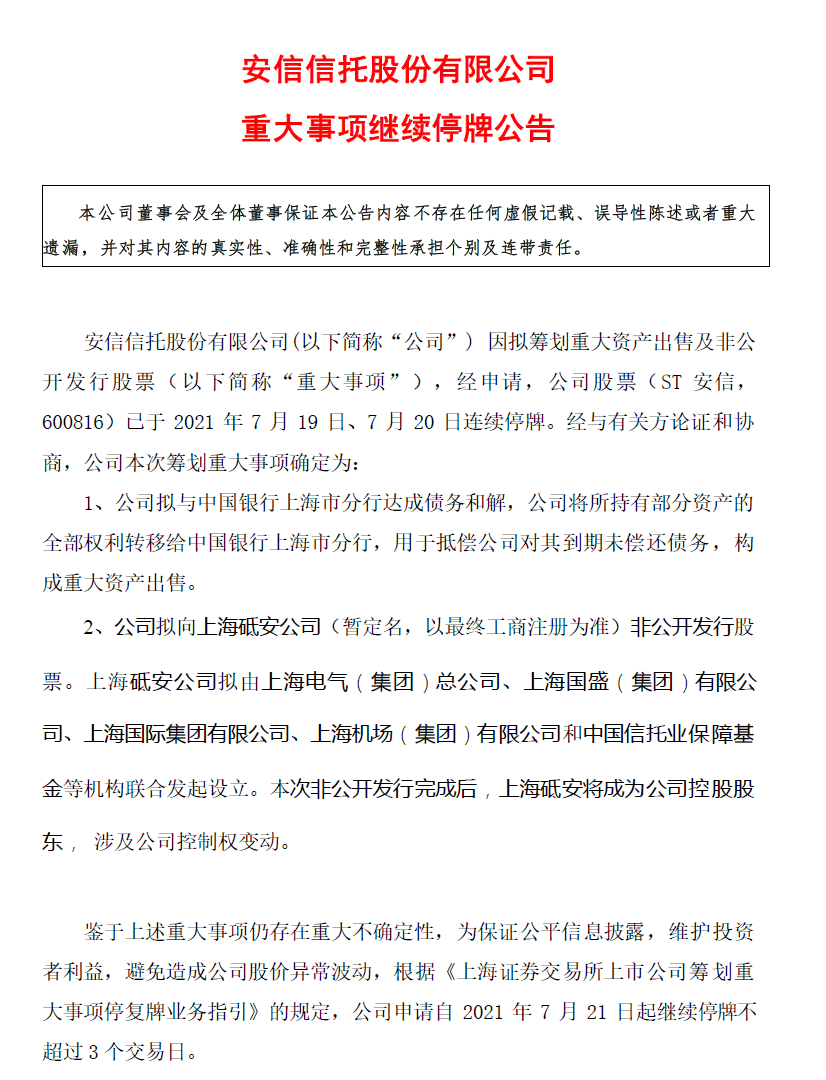 停牌兩個交易日之后,安信信托于今天下午再次發布了重大事項繼續停牌公告。
