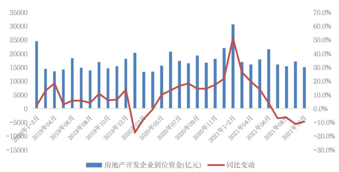 圖:2019年1月-2021年10月房地產開發企業到位資金情況(億元