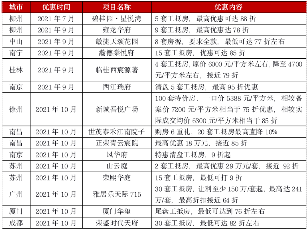 開發商若資金壓力較大,為了回籠資金可能會擴大讓利幅度。另一方面,“工抵房”由開發商折價抵押給供應商和施工方,若是供應商和施工方希望盡快匯款,可能會在原價格基礎上進一步讓利,擴大折扣。