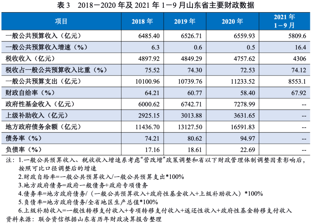 山東省經濟和財政實力強,GDP和一般預算收入規模長期排名全國前列,2021年1-9月,山東省經濟延續增長態勢。由于加大對改善民生以及經濟結構調整的支持力度,山東省政府債務余額持續增長,2020年末居全國第2位,距財政部下達的政府債務限額尚有一定的空間。山東省政府負債率在全國排名靠前,政府債務率在全國排名中游,考慮到山東省產業基礎和財政實力強,整體債務風險可控。