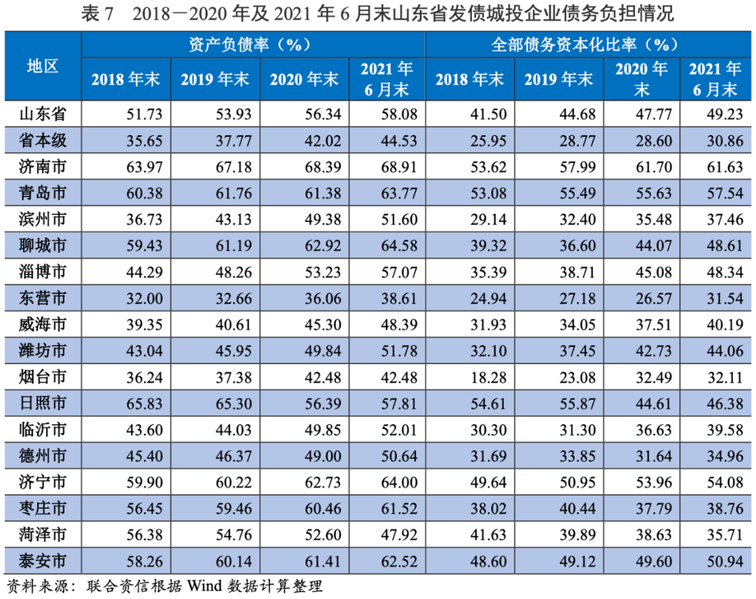 從發債城投企業債務負擔看,2018-2020年末,山東省發債城投企業整體資產負債率和全部債務資本化比率呈上升趨勢,山東省發債城投企業的債務負擔有所加重。從山東省各地級市城投企業債務指標看,截至2021年6月末,濟南市、青島市、濟寧市和泰安市的城投企業資產負債率均超過60%、全部債務資本化比率均超過50%,上述地級市的城投企業債務負擔較重。