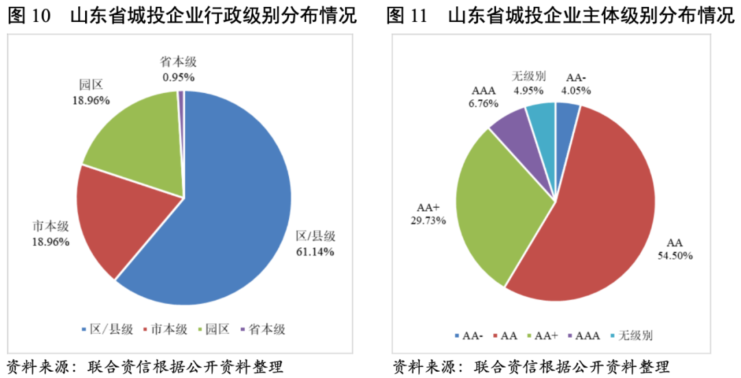 截至2021年10月28日,山東省有存續主體級別的城投企業共211家。其中,省本級城投企業2家,地級市本級城投企業40家,地級市下轄區級及縣級(含縣級市)城投企業129家,園區城投企業40家;主體級別為AAA的城投企業15家,主體級別為AA+的城投企業66家,主體級別為AA的城投企業121家,主體級別為AA-的城投企業9家。分地級市來看,濰坊市的城投企業數量最多,為42家,其次為青島市(41家)、威海市(16家)、臨沂市(15家)、濟南市(15家)、濟寧市(15家)和淄博市(11家),其余地級市城投企業數量相對較少。從級別分布看,AAA城投企業主要集中于省本級及經濟財政實力強的青島市和濟南市,其余地級市中只有煙臺市、臨沂市和濰坊市各有1家AAA城投企業,但上述地級市與青島市和濟南市的經濟和財政實力存在一定的差距。除聊城市和日照市以外,其余地級市均有AA+級別城投企業,聊城市和日照市城投企業最高級別為AA,級別為AA-的城投企業全部位于區縣和園區。