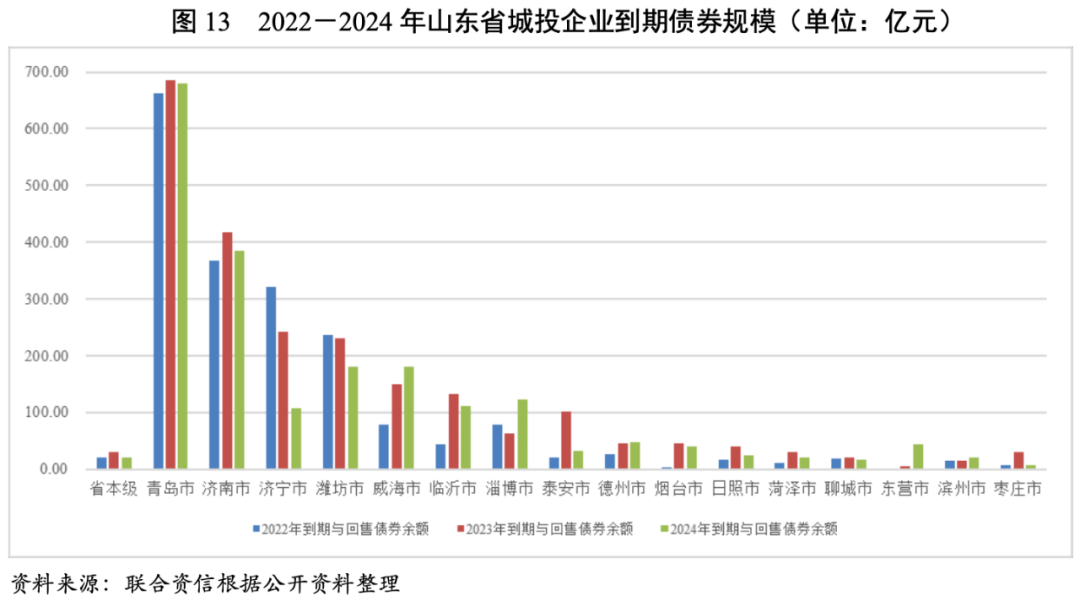 山東省各地級市的債務規模差異較大,濰坊市和青島市“發債城投企業全部債務+地方政府債務”/GDP的比值較高,濰坊市、威海市、青島市、濟寧市、泰安市、濱州市和濟南市地方政府財政收入對“發債城投企業全部債務+地方政府債務”覆蓋程度相對較低,需關注面臨集中償付壓力和地區債務負擔重的地級市的城投企業的再融資情況。