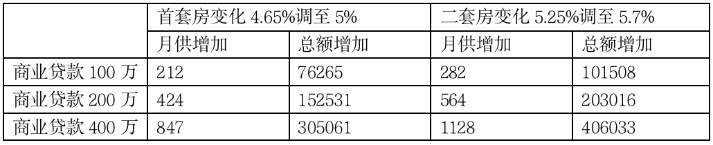 若以商業貸款200萬,30年等額本息計算,調整后,首套房需多還約15.3萬元,二套房需多還約20.3萬元,從月均還款額來看,每月約多還400-600元。