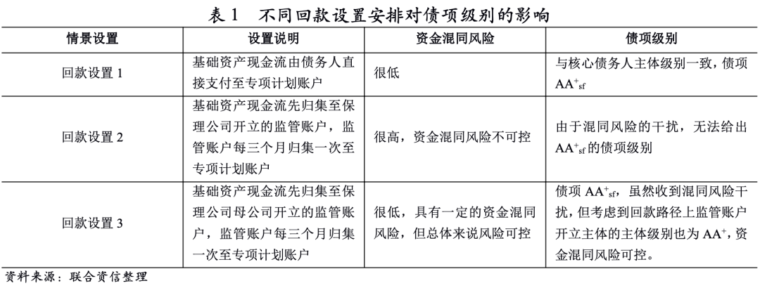 結構化產品另外一個交易結構的關注點就是基礎資產現金流的回款路徑和劃款頻率。眾所周知,國內資產證券化產品由于在法律等方面很難做到完全的破產隔離,基礎資產現金流和資產服務機構的其他現金流容易出現資產混同。現有緩釋這類風險的主要方式就是控制回款路徑和劃款頻率。也就是說,回款現金流從產生至歸集到專項計劃賬戶的路徑和頻率是結構化產品需要重點把控的環節。單一債務人供應鏈產品也是如此。目前市場上存續的單一債務人供應鏈產品基本上都能實現回款現金流閉環,即基礎資產現金流一旦產生,直接回流至專項計劃賬戶,這種情況下資金混同風險很低。但是評級根據多年的實踐,在大量的產品結構設計中,發現產品回款設置存在多樣性,不同的回款設置帶來高低不一的混同風險。所以即使底層基礎資產償付主體的償付能力和償付安排都相同,但也會可能由于基礎資產回款結構設置的不同而導致最終產品面臨不同的償付風險,最終影響債項的級別。