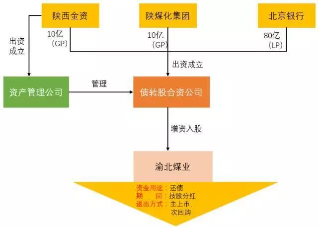 2016年底,陜西金資、陜煤化和北京銀行協議分別出資10億、10億和80億成立債轉股合資公司,合資公司100億元債轉股資金對陜煤化全資子公司陜西陜煤榆北煤業有限公司(以下簡稱“榆北煤業”)進行注資,完成債轉股。