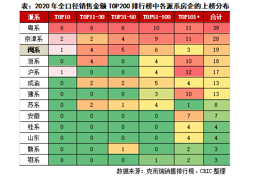 2020年合計19家閩系房企入圍克而瑞TOP200全口徑金額排行榜,與2017年排行榜基本持平,閩系房企上榜數量在所有派系房企中排名第3,僅次于粵系和京津系。主要原因在于福建經濟體量處全國上游,人口流動活躍,本省房地產市場較大,能誕生一定數量的規模房企。疊加福建人普遍具備較強海洋性民族特點,富有較強的冒險精神和商業意識,愛拼才會贏能體現其進取心態,相較于其余派系房企,閩系更具膽識,在過去一輪房地產高增長周期里敢于加足杠桿,重倉一二線城市,以此獲得可觀的市場份額。