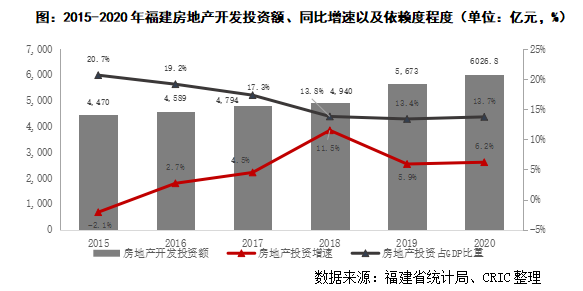 福建的房地產投資規模處于全國中上游水平,隨著近幾年房地產增速放緩,房地產占GDP的比重(房地產依賴度)逐年走低。從絕對值來看,2020年福建全省房地產開發投資6026.80億元,比上年增長6.2%,規模排名全國第8,處中上游水平。從相對值來看,2018年以后福建房地產調控政策逐漸加碼,房地產開發投資額增速開始回落,從2018年的11.5%下滑至2020年的6.2%。與此同時,房地產依賴度也呈逐年下滑趨勢,從2015年20.7%逐漸減少至2020年的13.7%。