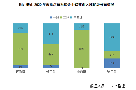 從各個區域的城市能級分布來看,中西部和環渤海一二線城市占比較高,長三角相對較為平均,而珠三角則是三四線占比最高。中西部城市的一二線城市占比達到86%,占比最高,且土儲量達到7000萬方以上,是長三角區域二線城市的1.8倍;環渤海區域一二線城市占比達到79%,天津、沈陽、太原是占比最高的三個城市,貢獻環渤海區域土儲的50%;而長三角區域分布相對比較均勻,杭州、蘇州、南京為貢獻最高的三個城市,合計占比32%,三四線城市中,紹興、無錫、徐州貢獻最高,合計占比15%,所以長三角區域內三四線城市雖然占比較高,但城市集中度相對小于一二線城市;而剔除福建省的珠三角區域中,佛山、廣州、珠海市貢獻最高的三個城市。