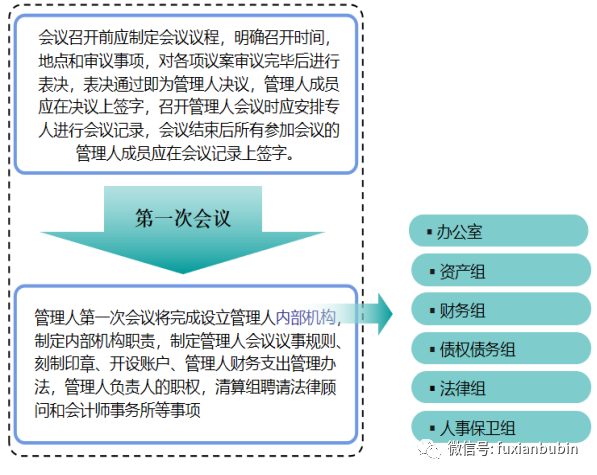 三是在管理人第一次會議討論設立管理人內部職能機構,正常情況下,在管理人內常設立的職能機構包括辦公室、資產組、財務組、債權債務組、法律組、人事保衛組,并對每個職能部門的職責予以明確,使各個職能機構之間進行有效分工;