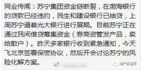 去年年底,有媒體報道稱,有傳言表示蘇寧集團(tuán)資金鏈斷裂,在渤海銀行的貸款已經(jīng)違約,民生和建設(shè)銀行已抽貸,上周蘇寧逼著光大銀行進(jìn)行展期。目前蘇寧正在通過民間借貸籌集資金(券商資管發(fā)產(chǎn)品,賣給散戶)。