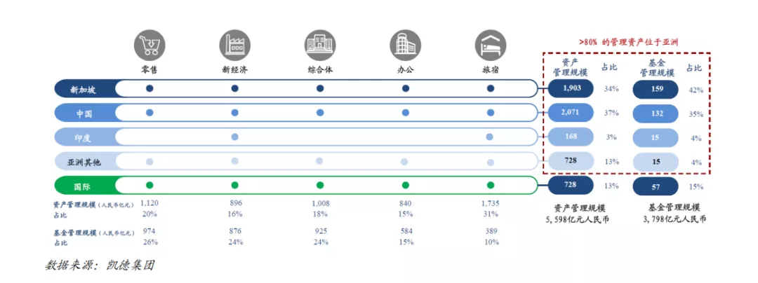 凱德投資的房地產基金管理規模(FUM)約為830億新元(約人民幣4000億元),通過6個上市房地產投資信托和商業信托,以及20多個私募基金持有。