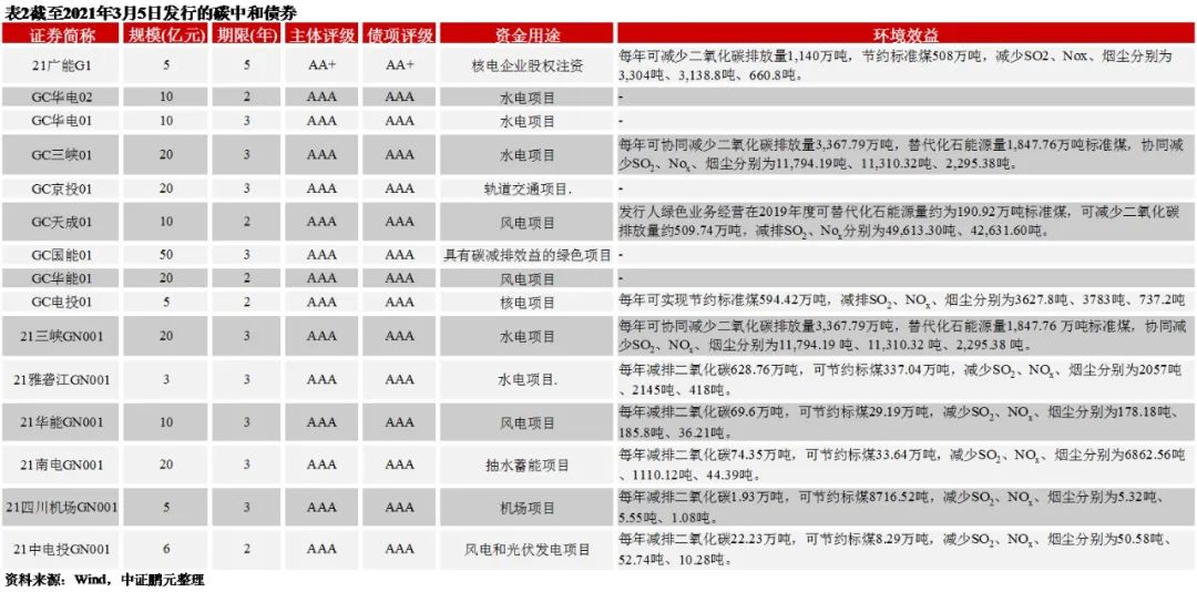 此外,綜合來看,目前碳中和公司債券、碳中和債務(wù)融資工具發(fā)行主體信用資質(zhì)為AA+、AAA級(jí)等高級(jí)別,屬于央企、地方國(guó)企;碳中和債券均是公開發(fā)行;債券期限方面,以2年期、3年期短期限品種為主;募投項(xiàng)目以水電、風(fēng)電、光伏發(fā)電、核電、抽水蓄能項(xiàng)目等清潔能源為主,也有軌道交通、低碳綠色建筑項(xiàng)目。從募投項(xiàng)目的環(huán)境效益來看,雖然均有碳減排環(huán)境效益,但是各項(xiàng)目減排的碳量有顯著差異,以募投項(xiàng)目每年減排的二氧化碳量來看,分布在1.93萬噸~3,367.79萬噸。