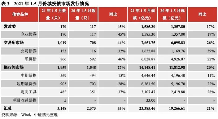 具體主要債券品種來看,受城投債發行政策收緊影響,5月份各品種城投債均出現了大幅下降。具體來看,企業債品種,以及交易所的一般公司債和私募債,中期票據環比降幅相對最大:5月份企業債品種僅發行城投債2只,發行規模18.50億元,均環比下降98%;交易所私募債的發行數量和規模分別環比下降80%和82%,公司債發行數量和規模分別環比下降78%和75%;銀行間市場的中期票據發行數量和規模也分別下降了79%和77%。2021年以來,高層將防范地方政府隱性債務風險作為工作重點,城投債發行政策邊際收緊。年初時交易所即將私募債發行人所在地債務率風險分檔作為審核要點;2月末下發的新《公司債券發行與交易管理辦法》中特別提到,城投平臺新發行債券不得添加地方政府債務負擔;4月下旬交易所發布交易所審核新規,對私募債發行規模較大的平臺形成利空。監管趨嚴疊加5月份是歷來債券發行淡月等因素,5月份城投債發行大幅下降。同比來看,各品種城投債券發行規模均出現同比下降,其中以企業債品種降幅較大,同比下降83%,其次是私募債發行規模同比下降56%。