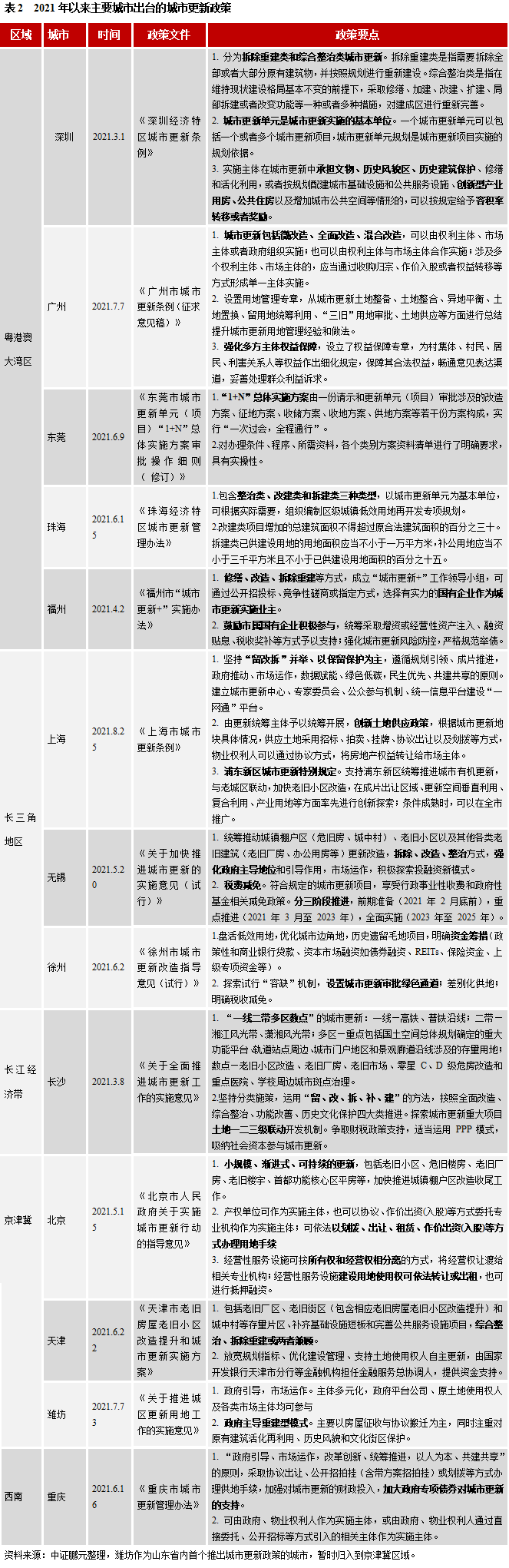 我國的城市更新發展由地方探索先行,具有典型的“自下而上”的特征,全國各地的步調不一致。粵港澳大灣區發展最為成熟,其中以深圳和廣州的政策體系最為完善,東莞、中山、惠州、佛山、肇慶等緊隨其后,目前已基本進入政策調整和完善期;長三角地區以上海為龍頭發展迅速,南京、杭州、無錫等地相繼發力;長江經濟帶武漢、長沙、南昌等地齊頭并進;京津冀區域發展相對較慢,北京、天津、石家莊正在穩步推進;西南區域,以重慶、成都、昆明、貴陽為主,近年來逐步啟動。