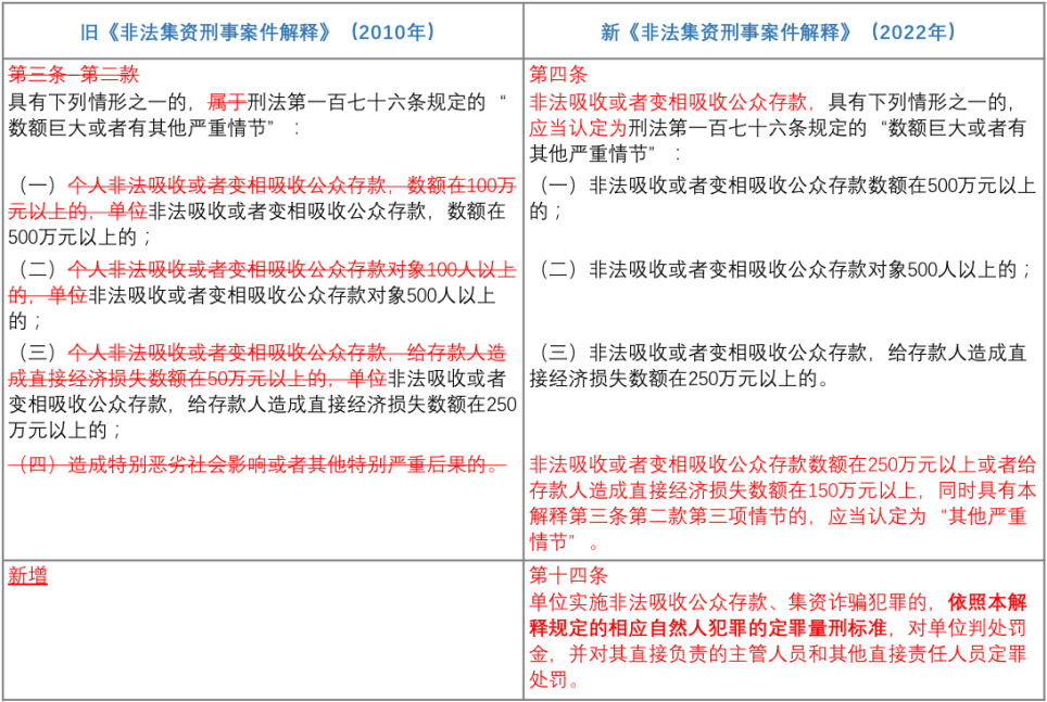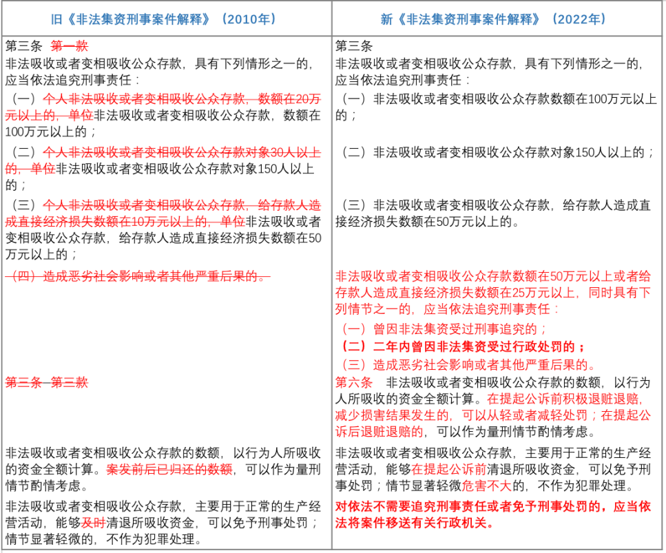 其中需要特別強調的在于,就非法吸收公眾存款罪的“立案標準”而言,新《非法集資刑事案件解釋》站在注重特殊預防的角度,針對行為人的再犯危險性進行評價。故而在非吸數額或者非吸造成損失數額僅達入罪標準的一半的情況下,若行為人曾因非法集資受過刑事處罰或者2年內因非法集資受過行政處罰的,也會被認定構成犯罪。