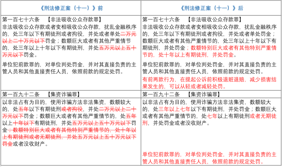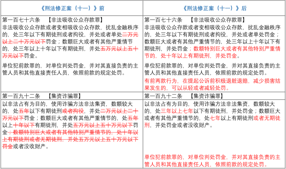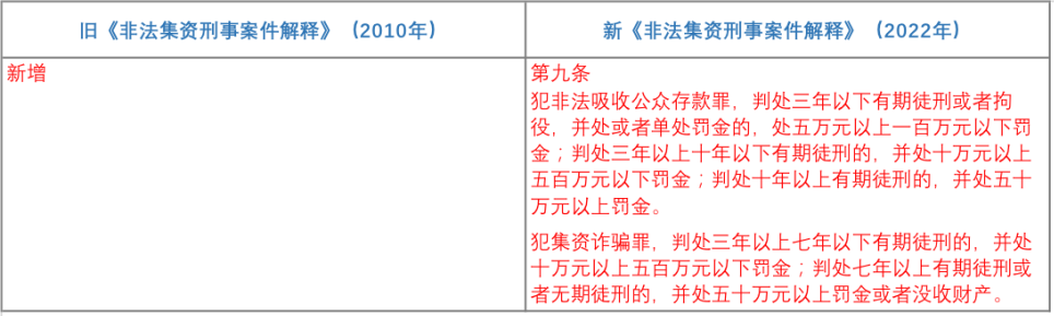 自2021年3月1日開始實施的《中華人民共和國刑法修正案(十一)》(以下簡稱“《刑修(十一)》),分別對非法吸收公眾存款罪與集資詐騙罪作出了重大修改,而為與《刑修(十一)》的修改相銜接,新《非法集資刑事案件解釋》亦作出了相對應的修訂。