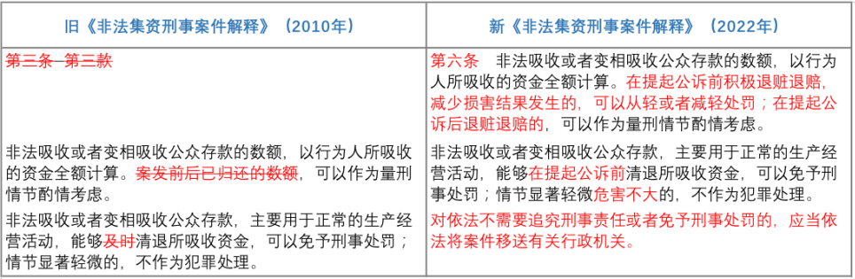 需要重點提示,《刑修(十一)》的上述規定,引起了新《非法集資刑事案件解釋》的相應變化。具體體現于“將吸收的公眾存款主要用于正常生產經營活動”這一情形中,可以以退贓退賠免予刑事處罰的最終時間點被明確了,由之前的“及時”修改為如今的“提起公訴前”。這一修改在事實上限縮了在上述情形中法院對被告人退贓退賠后免予刑事處罰的適用范圍,變相倒逼行為人在更早的階段中將贓款退賠。