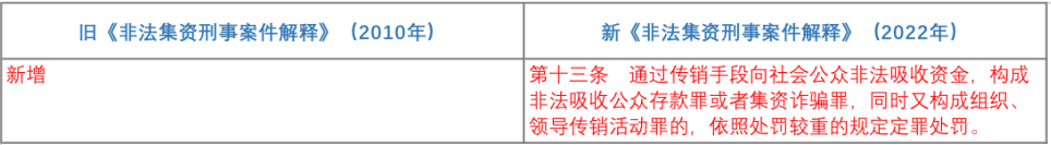 新《非法集資刑事案件解釋》在第十三條中明確了利用傳銷手段向社會公眾非法吸收資金時,同時構成非法吸收公眾存款罪(集資詐騙罪)與組織、領導傳銷活動罪時,兩罪按照想象競合處理的原則。這一規定系與2013年“兩高一部”發布的《關于辦理組織領導傳銷活動刑事案件適用法律若干問題的意見》第六條第一款規定的呼應。