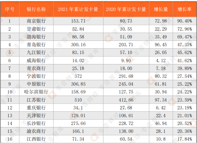 一、信用卡累計發卡:五家銀行過億,南京銀行增長超9成