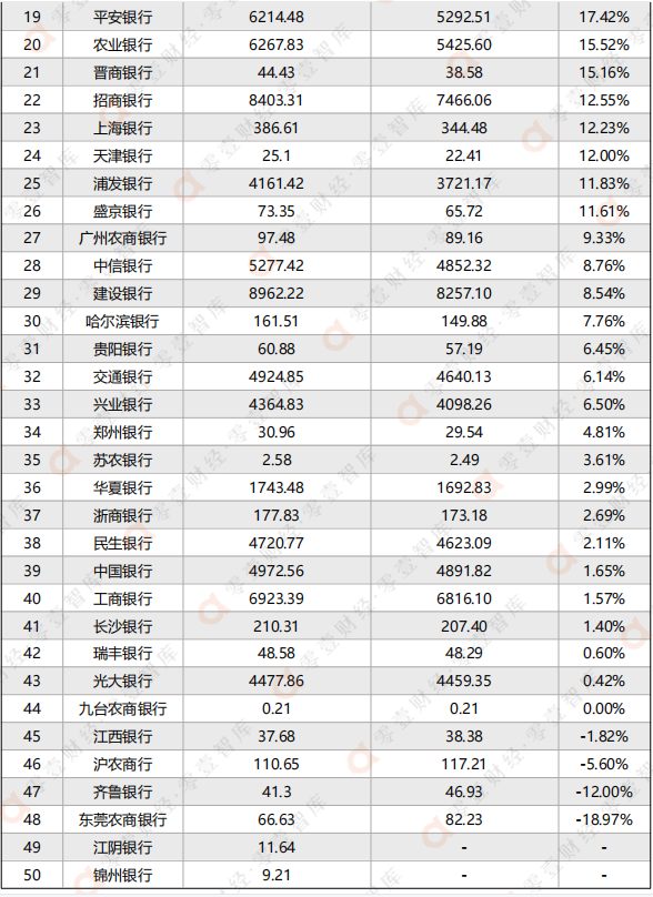 2、表格中各銀行根據同比增長率進行降序排列。