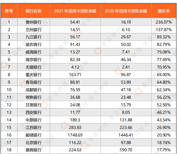 表3 各上市銀行2021年信用卡貸款余額增長情況
