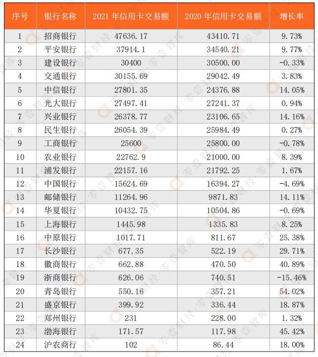 信用卡交易額作為各個銀行信用卡創收的基礎,在一定程度上同樣體現了信用卡業務體量,在這一維度共有24家銀行披露了相應數據,主要是國有銀行和股份制銀行以及部分城商行,農商行中僅有滬農商行有所披露,具體的交易額和增長情況如下: