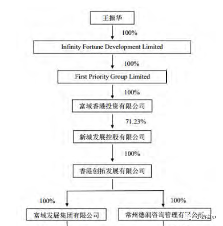 從股權結構看,新城控股的控股股東為富域發展,持股比例為61.09%,二股東常州德潤持股6.11%,實際控制人王振華通過富域發展和常州德潤間接持有公司67.2%股份。
