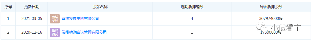據最新數據顯示,富域發展和常州德潤質押新城控股股份分別3.08億和1700萬股,股權質押率分別為22.35%和12.34%,可以看出質押率較高。