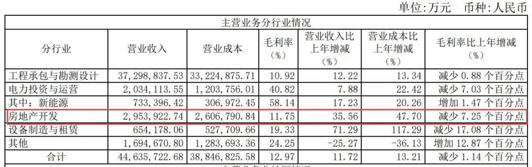 2021年報顯示,中國電建房地產板塊營收295.39億元,同比增長35.56%,營業成本同比增速47.7%高于營收同比增速;毛利率11.75%,同比下降7.25 個百分點;歸母凈利潤7856.28萬元,同比增長74.2%。