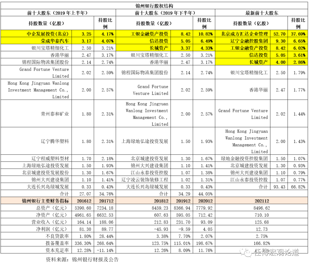 (1)和包商銀行另起爐灶不同的是,錦州銀行則是通過債務重組來完成處置。2019年,錦州銀行因年報延遲披露等原因而暴露風險,在監管部門的指導下進行改革重組,引入工銀投資、信達投資、長城資產等戰略投資者(持有3.25億股的中企發展投資(北京)與持有3.17億股的榮成華泰汽車前兩大股東退出),并轉讓部分內資股、剝離風險資產、實施增資擴股。