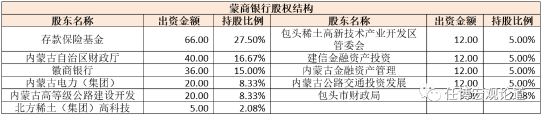(2)新成立的蒙商銀行注冊資本為200億元,股東出資為240億元。目前存款保險基金、內蒙古財政廳和徽商銀行分別位列蒙商銀行前三大股東,持股比例分別為27.50%、16.67%和15.00%。
