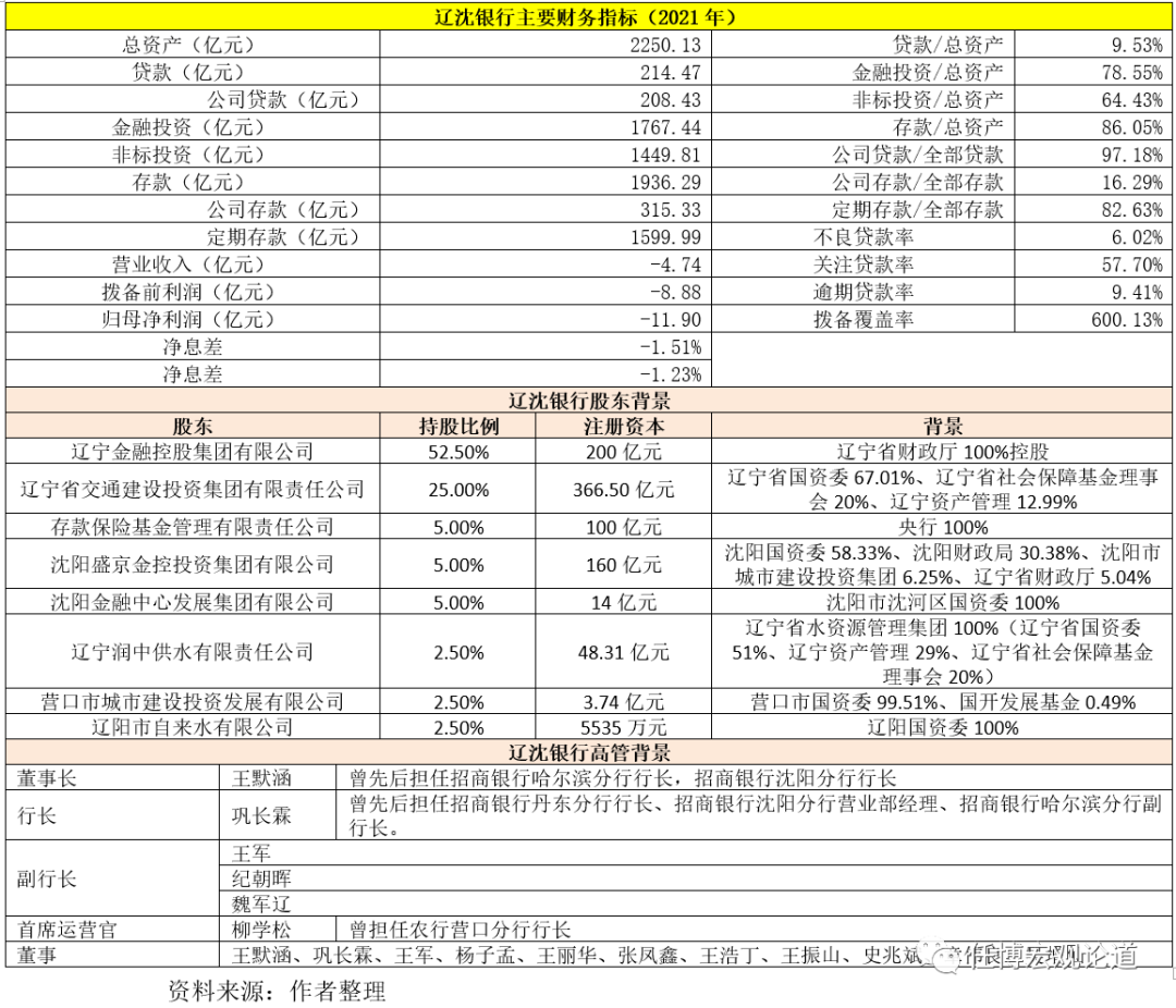 (6)遼沈銀行合并的兩家城商行,即遼陽銀行與營口沿海銀行總資產合計為2403.12億元、注冊資本合計為46.89億元,和披露的2599億元相差196億元,較100億元的注冊資本仍然高出96億元,預計是因為較2020年9月兩家城商行的總資產還有一定增長所致。根據遼沈銀行披露的2021年年報,截至2021年底,遼沈銀行總資產達到2250億元,存貸款余額分別為1936億元和214億元,全年實現營收-4.74億元、凈虧損11.90億元、不良貸款率高達6.02%。