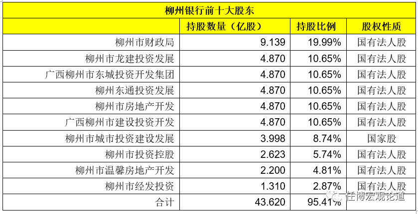 (3)多次調整后,目前柳州銀行的前十大股東均為國資背景,合計持股比例高達95.415,且柳州市財政局的持股比例達到19.99%。