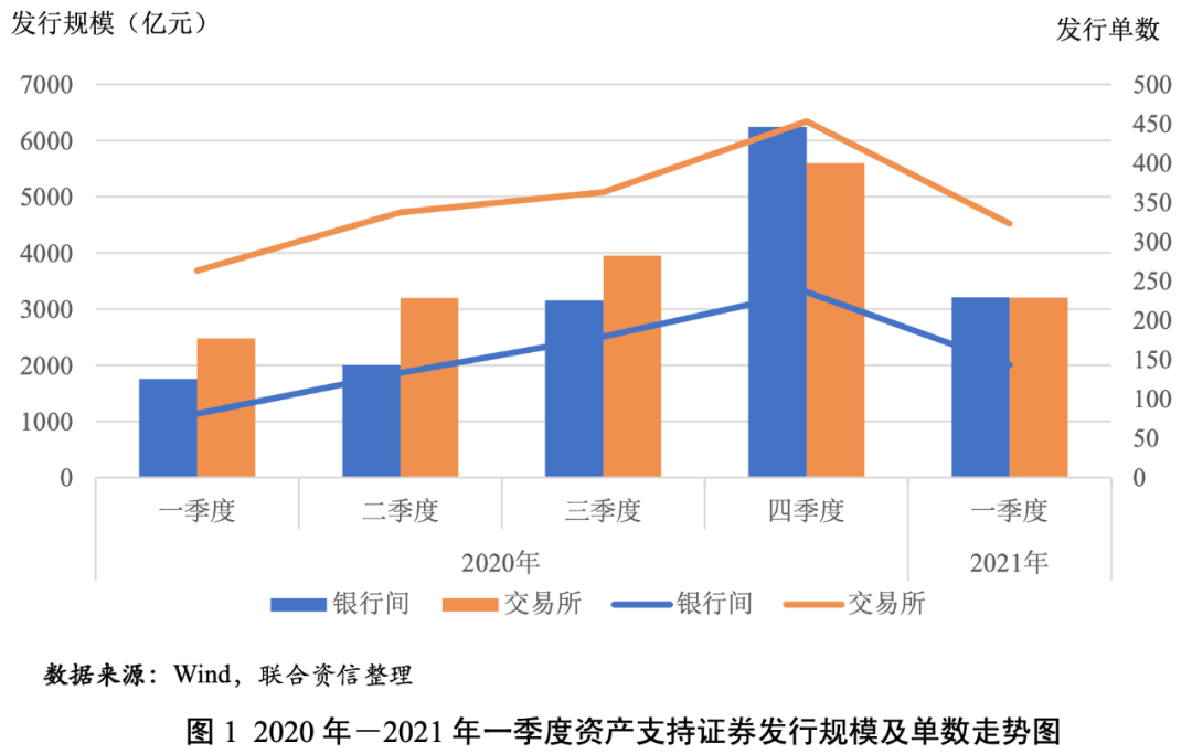 2021年一季度,我國資產支持證券市場在發展中不斷規范和創新。監管政策方面,2021年1月5日交易商協會發布《關于規范資產支持票據業務盡職調查行為有關事項的通知》,試行《非金融企業資產支持票據業務盡職調查指引(試行)》。產品創新方面,2021年2月26日,國內首單版權資產證券化產品成功發行;2021年3月9日,國內首單碳中和資產支持票據成功發行。