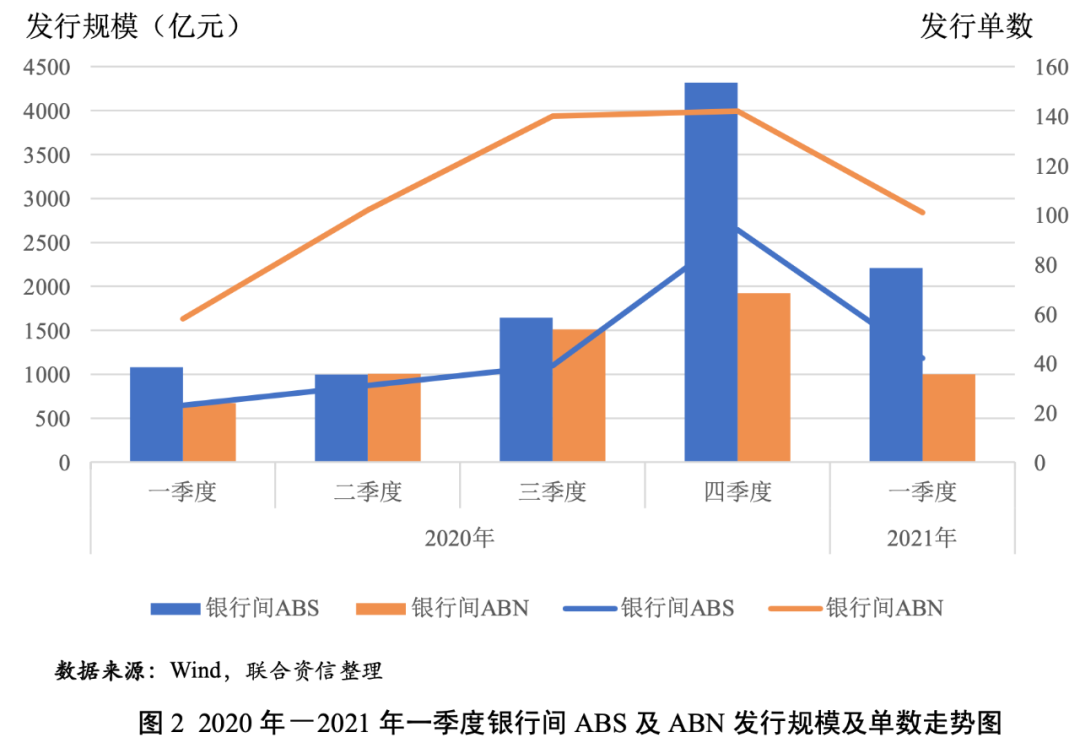 從銀行間市場來看,2021年一季度,信貸資產支持證券(以下簡稱“銀行間ABS”)共發行42單125只,發行規模為2209.93億元,發行單數、只數和規模環比均有所下降,同比均有所上升;銀行間資產支持票據(以下簡稱“銀行間ABN”)共發行101單254只,發行規模為1000.27億元,發行單數、只數和規模環比均有所下降,同比均大幅增長(見表2和圖2)。總體看,一季度銀行間ABS發行單數、只數和規模同比增幅較銀行間ABN更高。一季度銀行間市場出現創新產品類型,如國網租賃發行了全國首單綠色碳中和資產支持商業票據(ABCP),實現了綠色金融模式的創新,為引導產業結構、能源結構向綠色低碳轉型,提供了有力的金融支持。