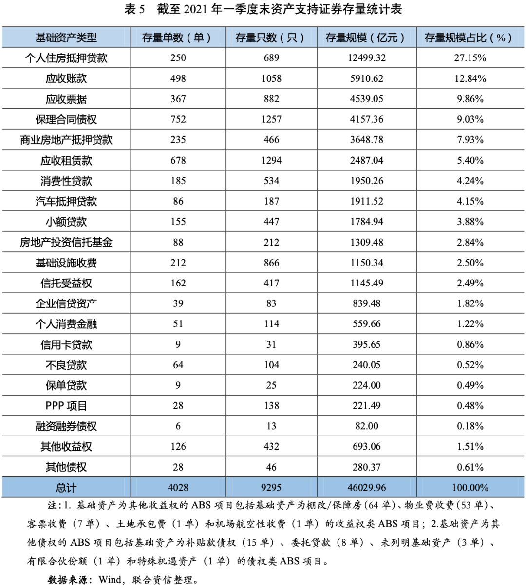 截至2021年一季度末,債券市場上共有4028單9295只資產支持證券存續,本金存量規模為46029.96億元。從存量規模占比來看,前五大基礎資產類型分別為個人住房抵押貸款(27.15%)、應收賬款(12.84%)、應收票據(9.86%)、保理合同債權(8.91%)和商業房地產抵押貸款(7.93%)。