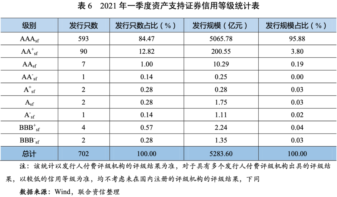 2021年一季度,新發行的資產支持證券中,有702只具有信用評級,總體上集中于AAAsf和AA+sf,AAAsf級資產支持證券的發行只數占比84.47%,發行規模占比95.88%;AA+sf級資產支持證券的發行只數占比約12.82%,發行規模占比約3.80%。