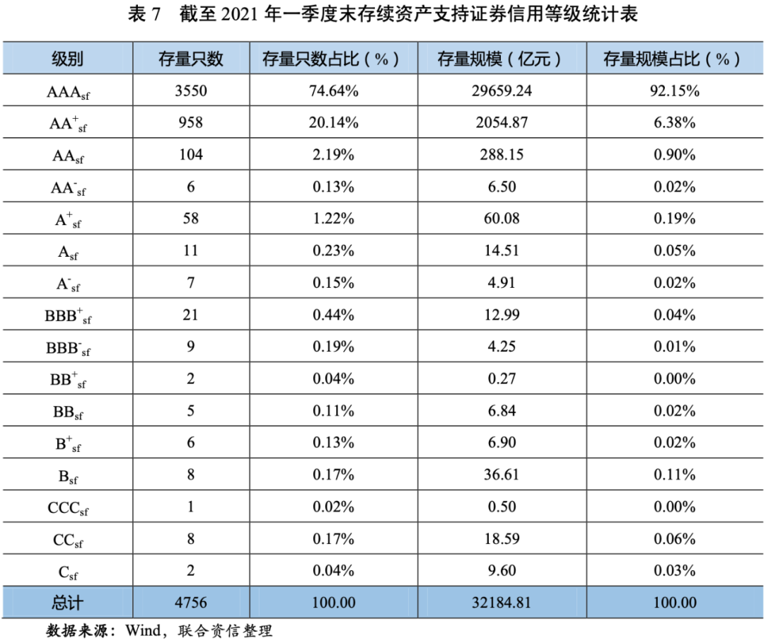 截至2021年一季度末,在存量資產支持證券中,有4756只具有信用評級,集中于AAAsf、AA+sf和AAsf三個等級。AAAsf級、AA+sf級和AAsf級資產支持證券的存量只數占比分別為74.64%、20.14%和2.19%,存量規模占比分別為92.15%、6.38%和0.90%。