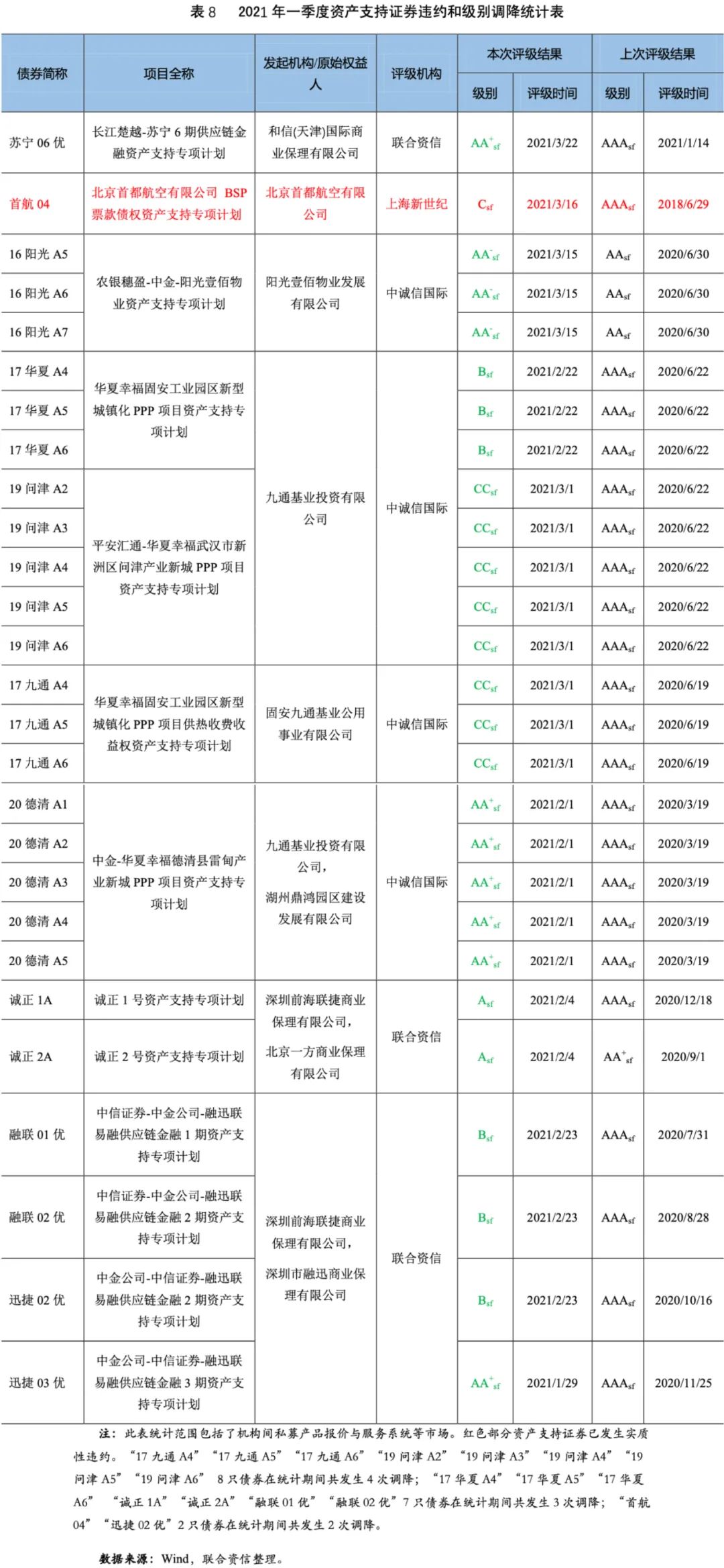 級別下調方面,市場共有9家原始權益人發起的13單27只資產支持證券債項評級發生下調,原始權益人家數同比增加6家,發行單數同比增加11單,只數同比增加25只。其中“華夏幸福固安工業園區新型城鎮化PPP項目資產支持專項計劃”“平安匯通-華夏幸福武漢市新洲區問津產業新城PPP項目資產支持專項計劃”“華夏幸福固安工業園區新型城鎮化PPP項目供熱收費收益權資產支持專項計劃”“誠正1號資產支持專項計劃”“誠正2號資產支持專項計劃”“中信證券-中金公司-融迅聯易融供應鏈金融1期資產支持專項計劃”“中信證券-中金公司-融迅聯易融供應鏈金融2期資產支持專項計劃”“中金公司-中信證券-融迅聯易融供應鏈金融2期資產支持專項計劃”“北京首都航空有限公司BSP票款債權資產支持專項計劃”9單資產支持證券評級大幅下調,共涉及17只資產支持證券。本季度資產支持證券發生評級下調的原始權益人主要集中于九通基業投資有限公司(涉及13只債券)和深圳前海聯捷商業保理有限公司(涉及6只債券),下調原因主要是受到外部擔保人、差額支付承諾人、共同債務人違約的影響。例如,九通基業投資有限公司和深圳前海聯捷商業保理有限公司發起的大部分資產支持證券由華夏幸福基業股份有限公司作為外部擔保人或差額支付承諾人[6],2020年1月份以來,由于新冠疫情疊加環京房地產調控政策嚴厲導致華夏幸福基業股份有限公司的主營基金銷售金額及回款同比下滑,經營業績承壓,財務狀況惡化,同時,公司債務規模持續攀升、短期債務占比上升,杠杠水平持續高位,2021年1月份以來華夏幸福基業股份有限公司主體評級連續被下調至C級,并由此引發其增信的關聯方九通基業投資有限公司和深圳前海聯捷商業保理有限公司發起的大部分資產支持證券的級別下調。