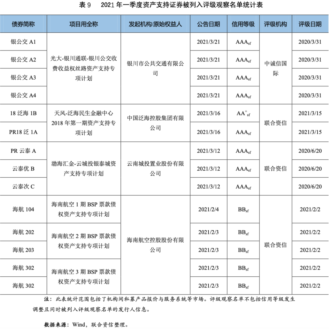 2021年一季度,債券市場上有1只資產支持證券首次發生違約[3](表10),同比未發生變化;27只資產支持證券信用評級下調[4],同比增加25只;14只資產支持證券被列入評級觀察名單[5](表11),同比增加10只。
