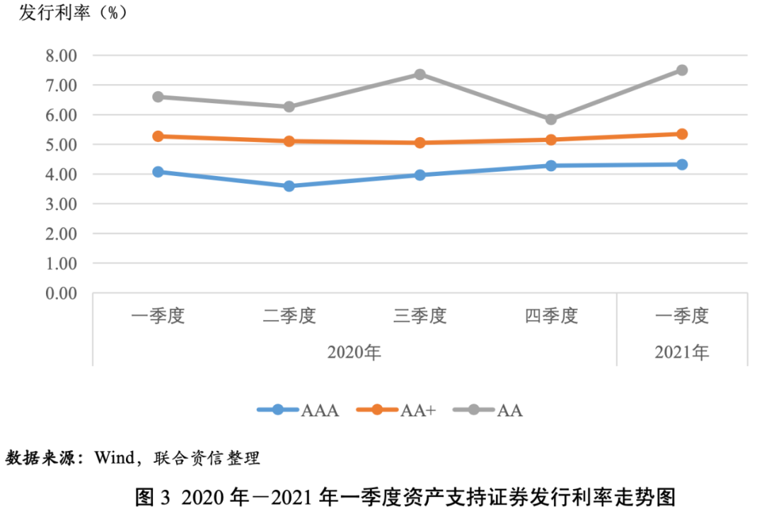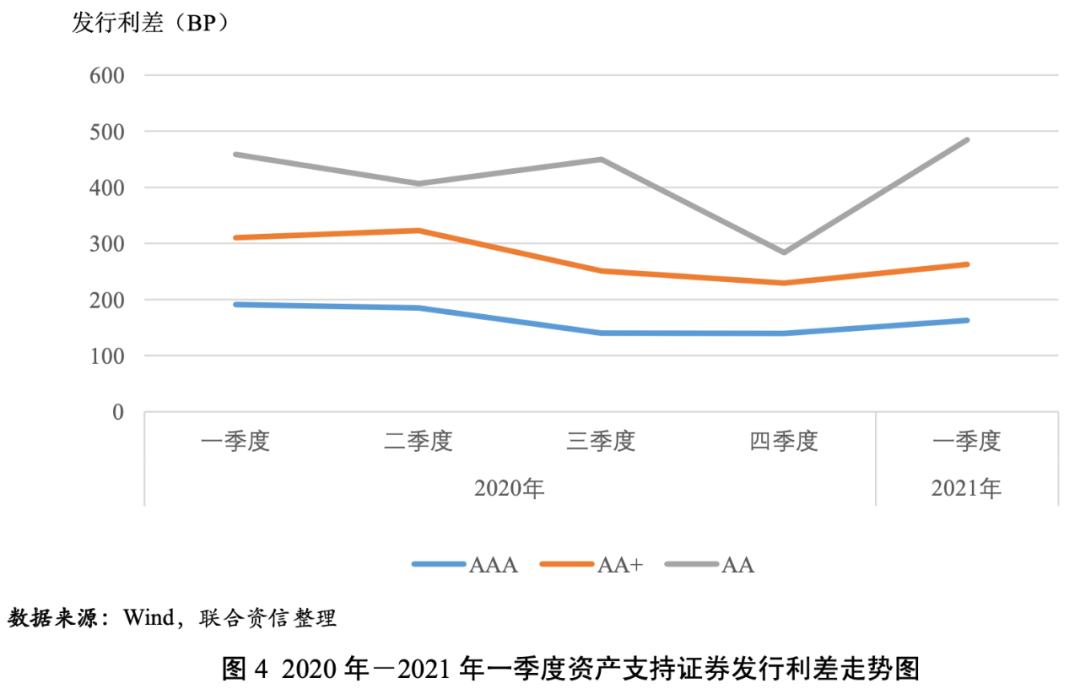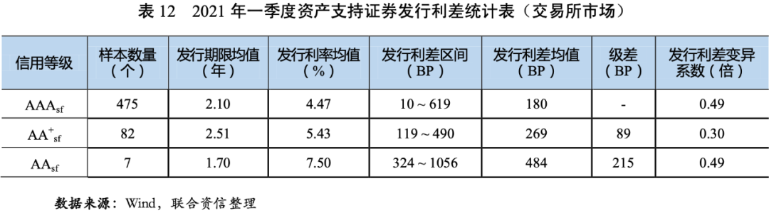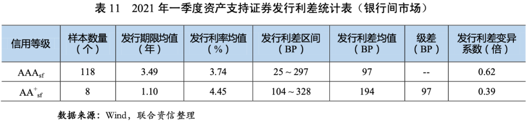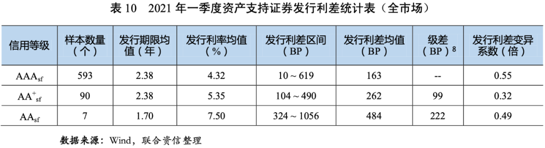 2021年一季度,資產支持證券的發行利率和利差均值均隨信用等級的下降而上升,說明信用評級對資產支持證券的信用風險具有較好的區分度。AAAsf、AA+sf和AAsf級資產支持證券的發行利差均值分別為163BP、262BP和484BP,AAAsf、AA+sf和AAsf級資產支持證券的發行利差均值環比分別上升24BP、33BP和201BP;AAAsf級和AA+sf級資產支持證券的發行利差同比分別下降28BP和47BP,AAsf級資產支持證券的發行利差同比上升26BP。AAAsf級和AA+sf級、AA+sf級和AAsf級之間的級差分別為100BP和222BP,級差隨級別的下降而上升,反映了在經濟恢復不均衡、貨幣政策回歸常態的背景下,市場不確定性上升,投資者對低級別資產支持證券要求的風險溢價進一步提高。AAAsf級資產支持證券的發行利差的變異系數相對較高,說明投資者對AAAsf級資產支持證券的信用風險判斷存在分化。