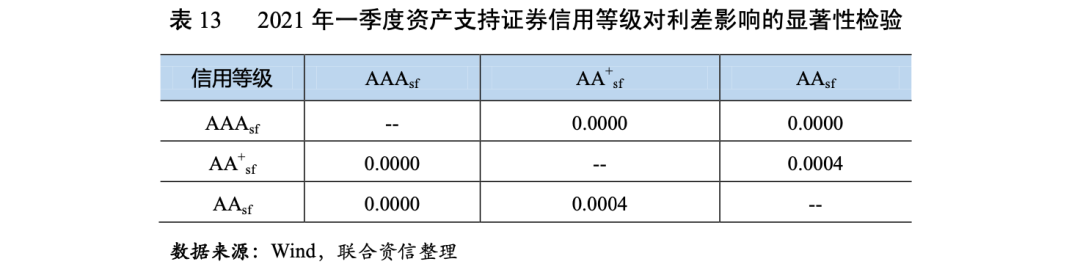 為了檢驗信用等級對資產支持證券發行利差影響的顯著性,我們采用了Mann-Whitney U 兩獨立樣本非參數檢驗方法,對AAAsf、AA+sf和AAsf級兩兩之間的利差分布進行顯著性檢驗。2021年一季度,在95%的置信水平下,AAAsf級和AA+sf級、AAAsf級和AAsf級之間、AA+sf級和AAsf級之間均通過檢驗,具有顯著性差異。整體來看,信用等級對發行利差具有區分性,評級結果得到了投資者認可(表13)。