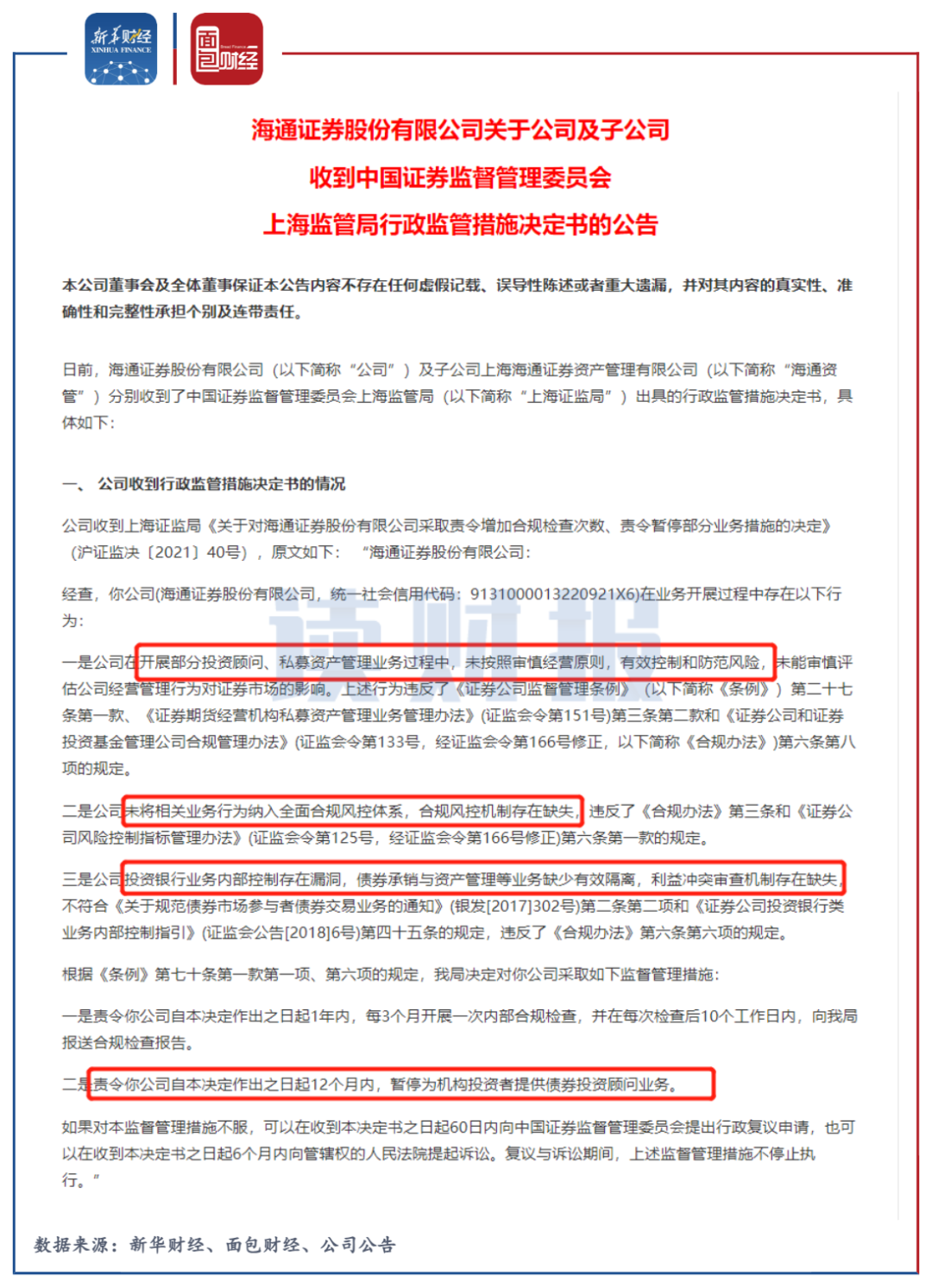 在資管業務方面,2021年3月,海通證券收到證監會上海監管局的行政監管措施決定書,因為合規和風控漏洞,監管部門做出“12個月內,暫停為機構投資者提供債券投資顧問業務”的處罰決定。