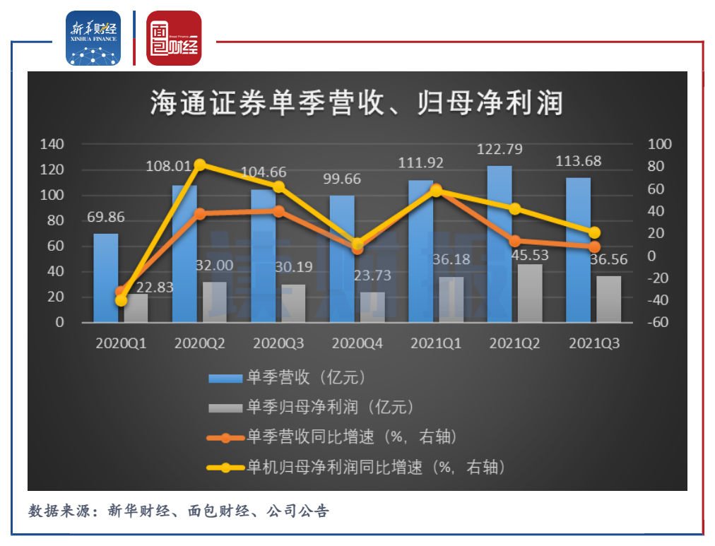 但是,2021年第三季度,海通證券的單季營收與凈利潤同比增速顯著下滑。財報顯示,2021年第三季度,海通證券營業收入和歸母凈利潤增速分別僅為8.62%和21.1%,較上半年明顯下降。
