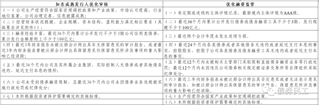 1、《優化審核》明確了符合知名成熟發行人的界定范圍,主要是從財務指標、債券發行情況等幾個可以量化的指標進行區分。從設置的指標來看,《優化審核》去掉了“最近兩個會計年度連續發生虧損”這個指標,這對于部分虧損企業來說,是非常有利的。其他的條件基礎條件,基本是一致的。